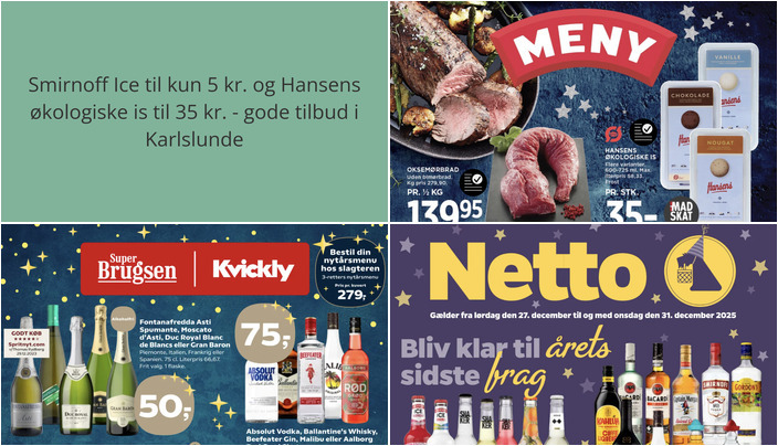 Netto har et skarpt tilbud på Smirnoff Ice, Shaker eller Mokai, hvor du kan købe 27,5 cl for kun 5 kr. pr. stk. Tilbuddet gælder fra lørdag den 27. december til onsdag den 31. december, med en begrænsning på 24 stk. pr. variant pr. kunde pr. dag.